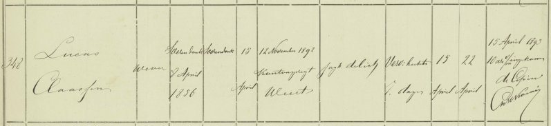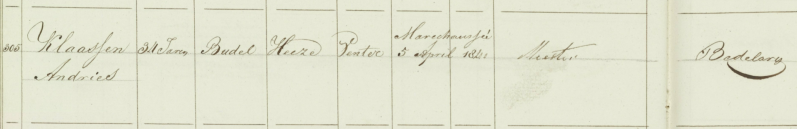 Geboren te Heeze, 2 februari 1867 als Andries, zoon van Martinus Klaassen, wever en Peternel van Bakel (1). Overleden te Breda, 15 maart 1887, oud 20 jaar (2). Adres: 1887 Breda, aan de Haagdijk, wijk C, nr. 144 (2).