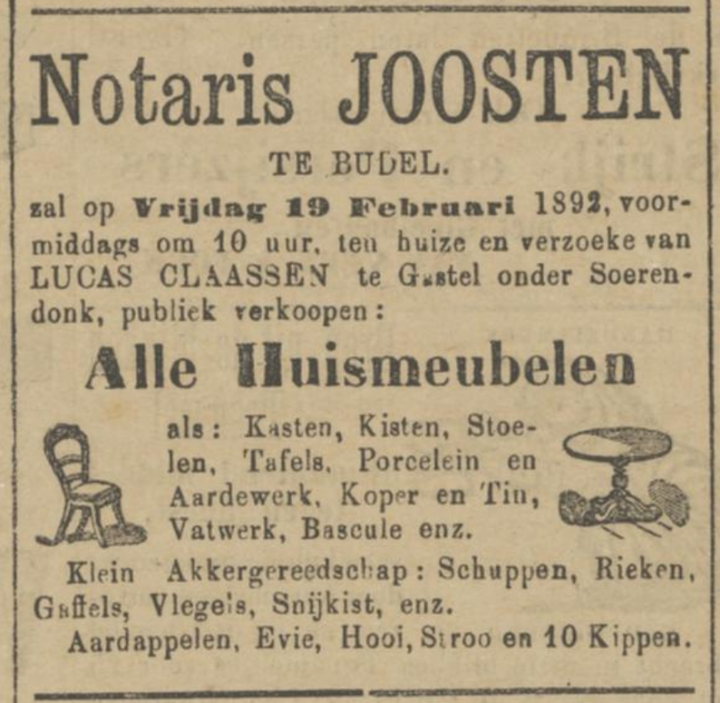 Gedoopt te Someren (RK Sint Lambertus), 5 december 1686, zoon van Henricus Joosten en Henrica Gielis (1). Gehuwd te Budel (Schepenbank) (RK Onze Lieve Vrouw Visitatie), 25 januari 1722 met JOSINA GOORT SOMERS, ook geschreven als JUSTINA GOORT SOMERS, JUSTINA SOMMERS, JUDOCA GOORTS, JOSIJN KLAASEN, weduwe van Adriaen Jacobs (2)(3). Gedoopt te Tongelre (RK Sint Martinus), 17 februari 1693, dochter van Goedefridus Sommers en Joanna Josephus (4). Begraven te Maarheeze, 1 augustus 1774, weduwe, laat na kinderen (5). Adres: 1722 Soerendonk, Cauwenbergh (2). 1774 Soerendonk (5).