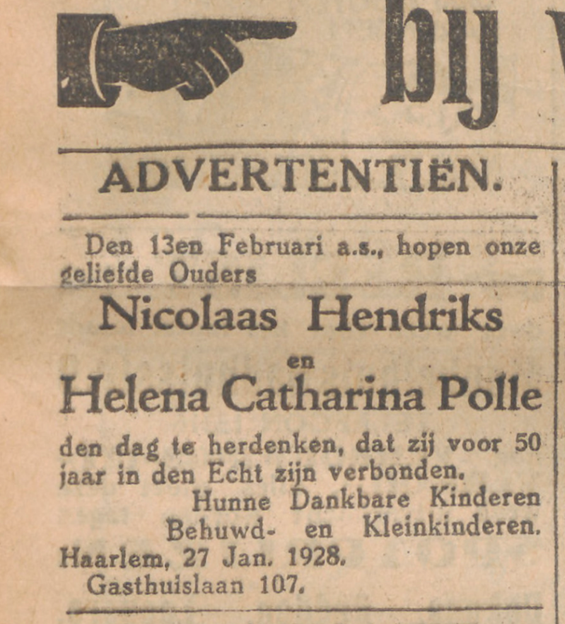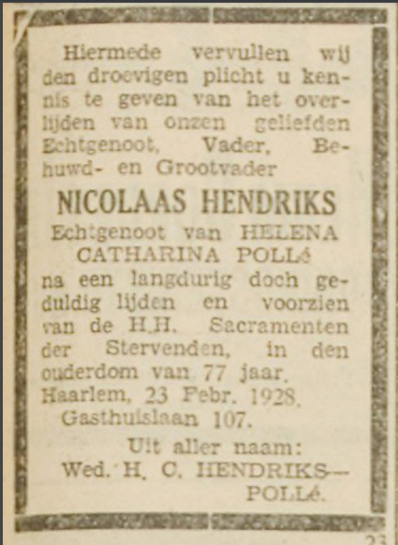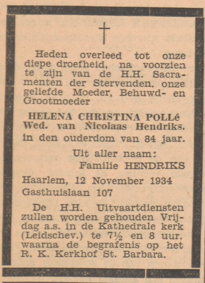 Beroep: naaister (1). Geboren te Heemstede, 12 december 1883 als Johanna Helena, dochter van Nicolaas Hendriks, bloemistknecht en Helena Catharina Pollé (2). Overleden te Haarlem, 9 mei 1937, oud 53 jaar, ongehuwd (1). Adres: 1937 Haarlem, Kamperlaan (1), 1937 Haarlem, Gasthuislaan, nr. 107 (1).