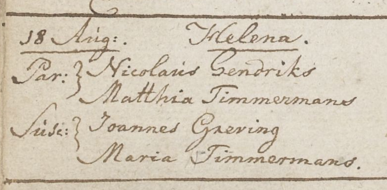 1 HENRICA PELLEMANS, gedoopt te Budel (RK Onze-Lieve-Vrouw Visitatie), 18 maart 1802 als Henrica, dochter van Franciscus Pellemans en Joanna Maria Staels (23).
