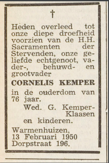 5 Burgerlijke stand gemeente Heemskerk, overlijdensregister 1950, akte 14, folio 4v.