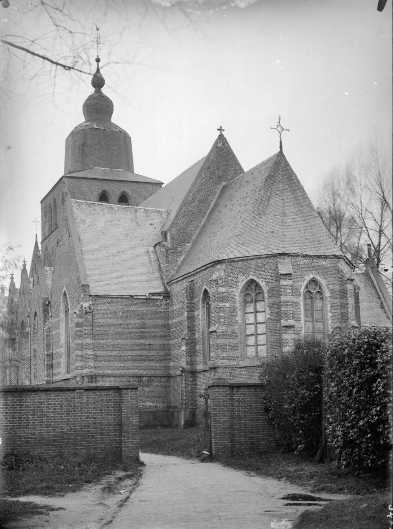 Afbeelding links: De oude laatgotische St. Gertrudiskerk te Maarheeze. Gebouwd omstreeks 1450, gesloopt in 1911. Thans vervangen door een modern RK-kerkgebouw.